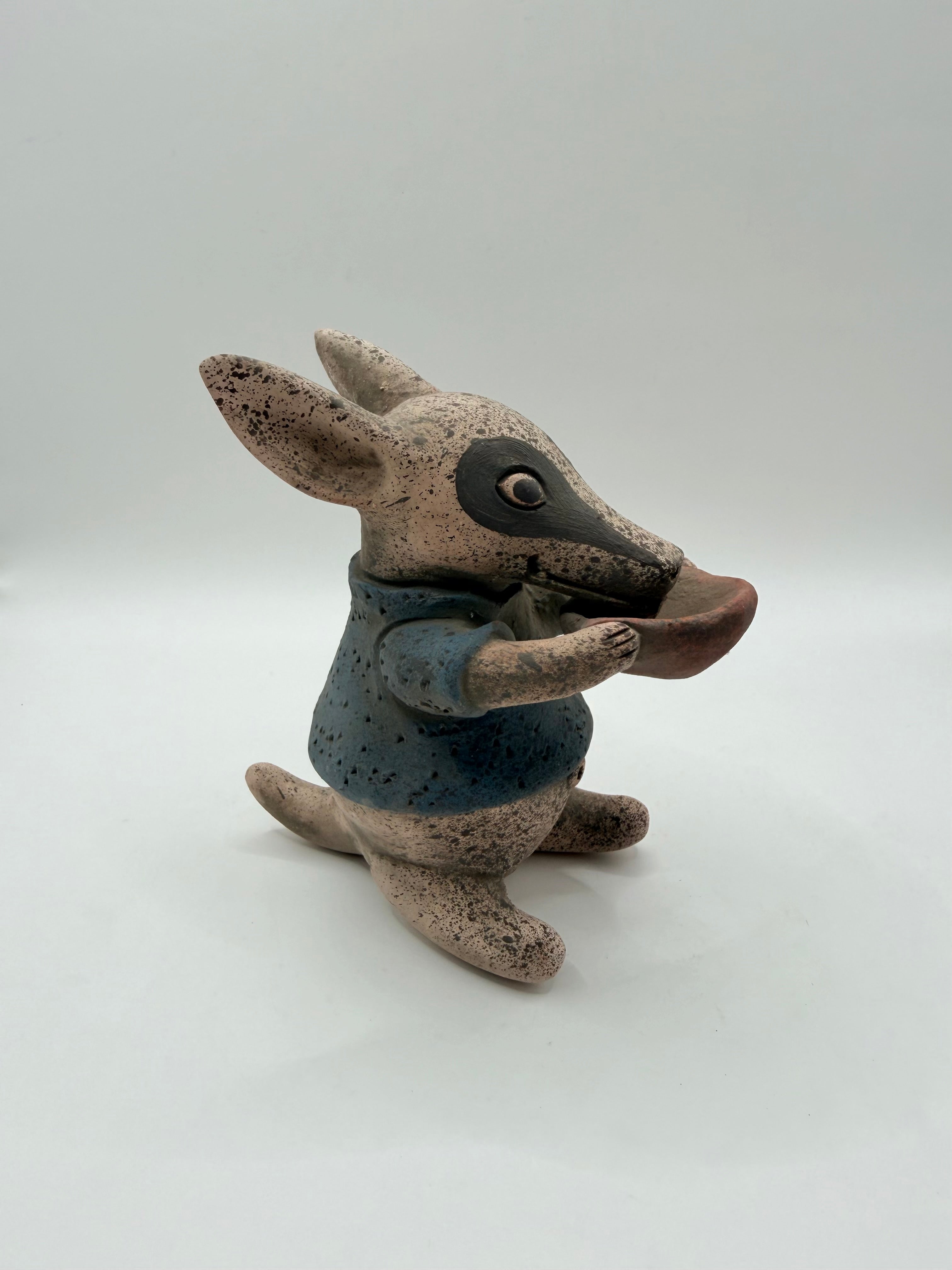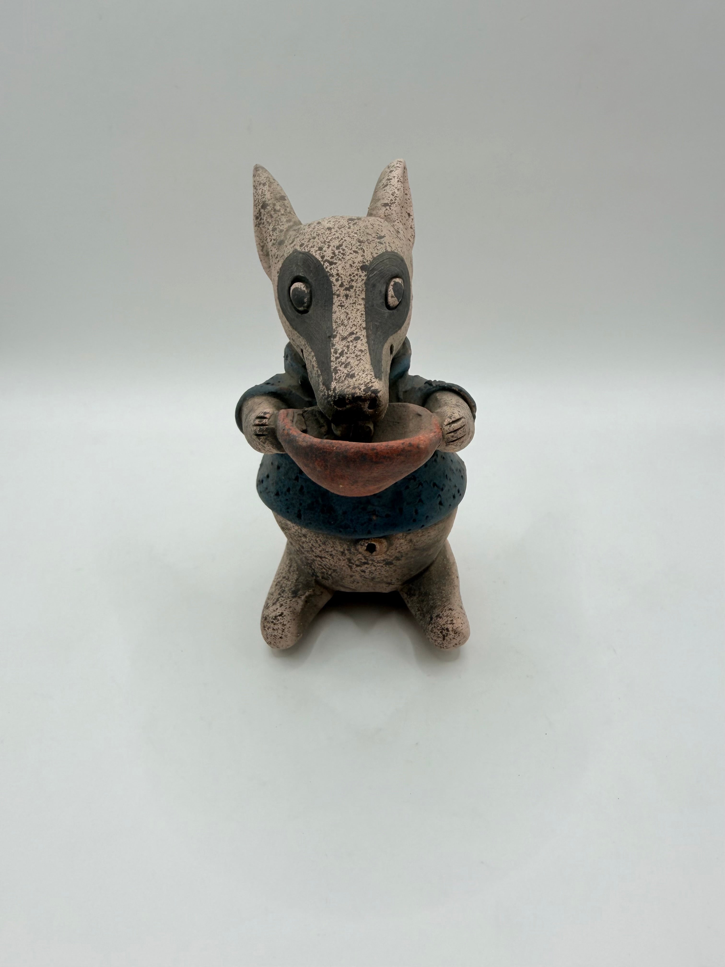 Réplica de barro, Tlacuache chico color arena ojos negros con jícara roja