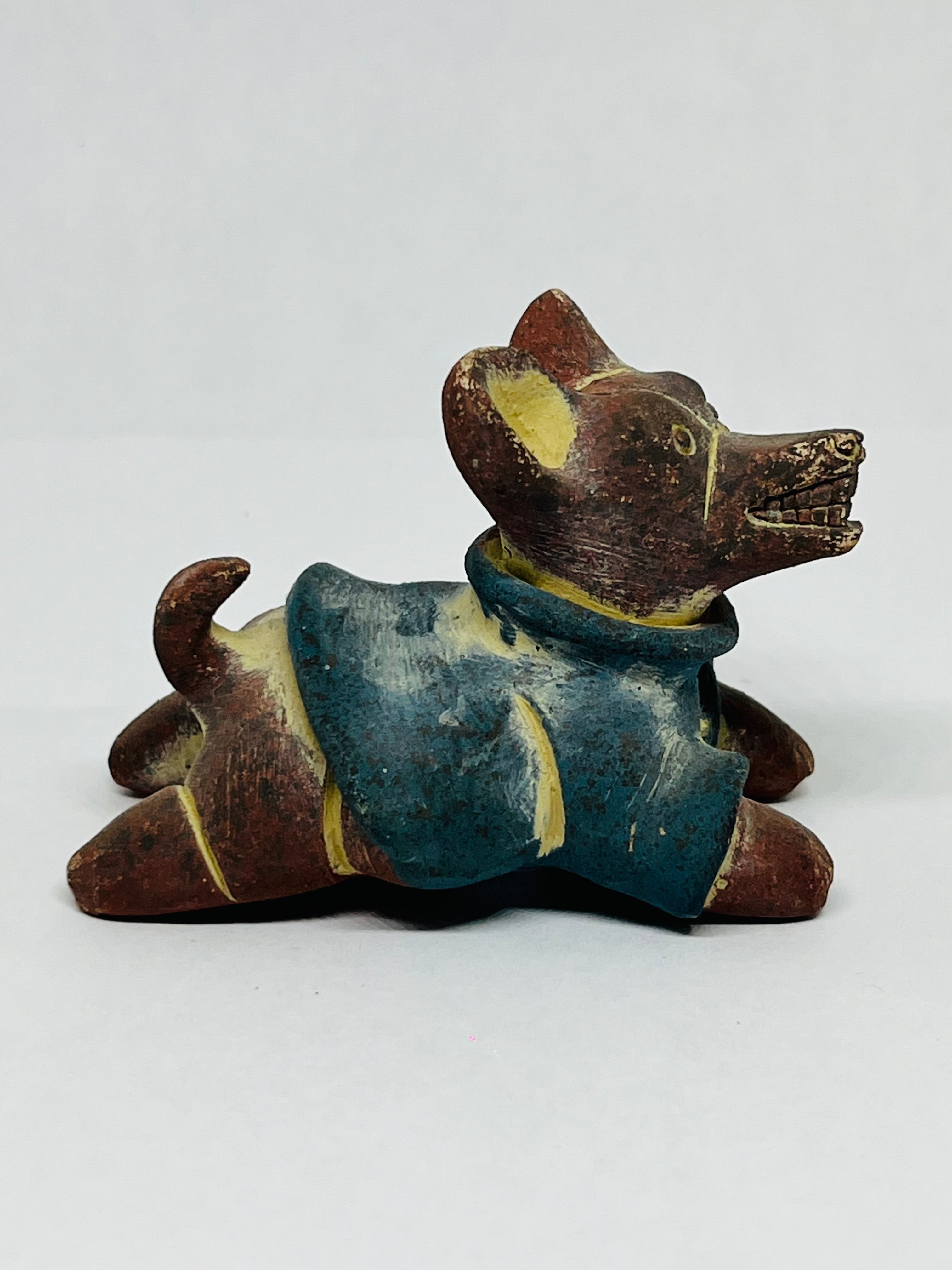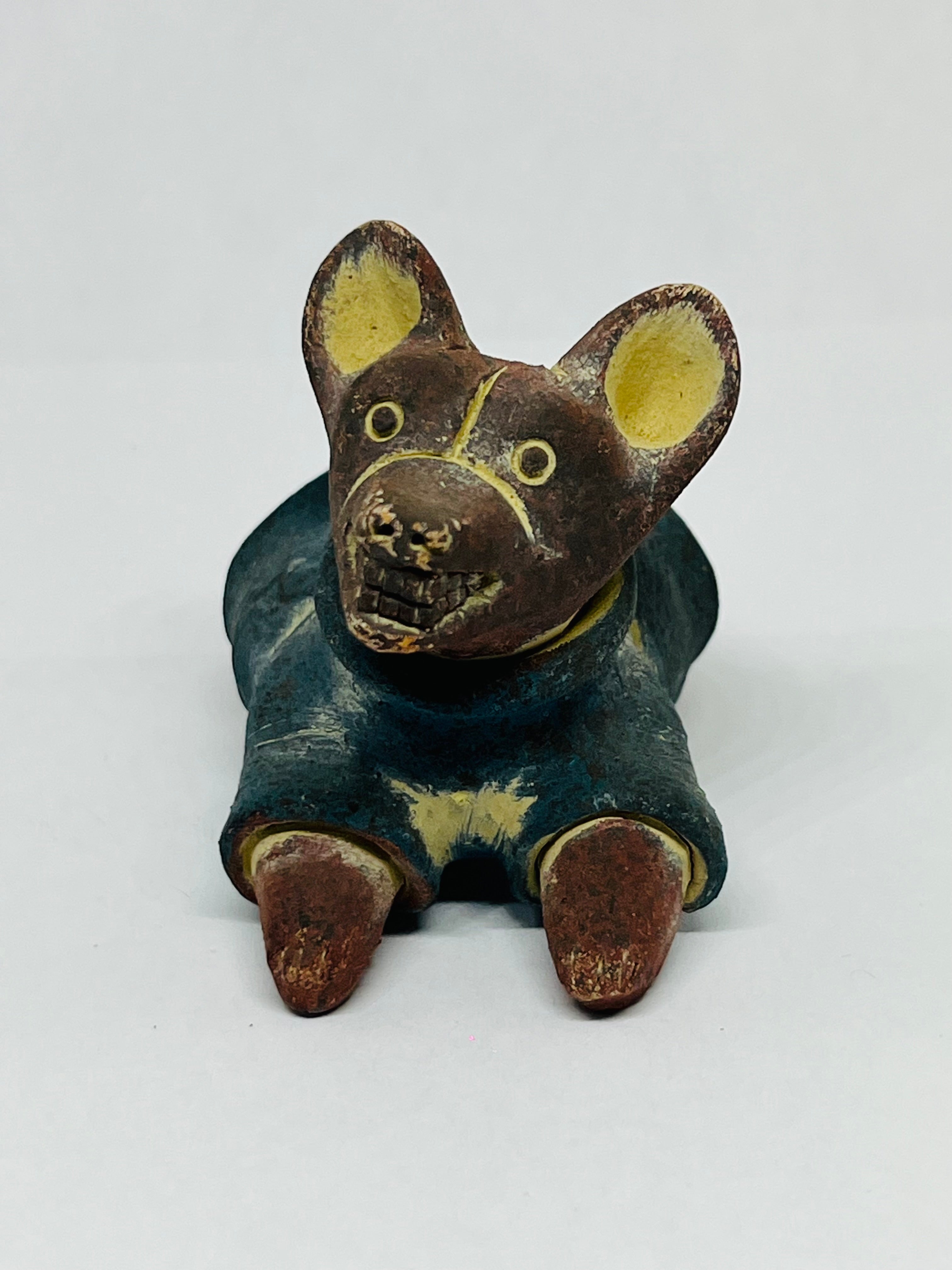 Réplica de barro, Xolo mini con suéter azul estirado viendo lado derecho