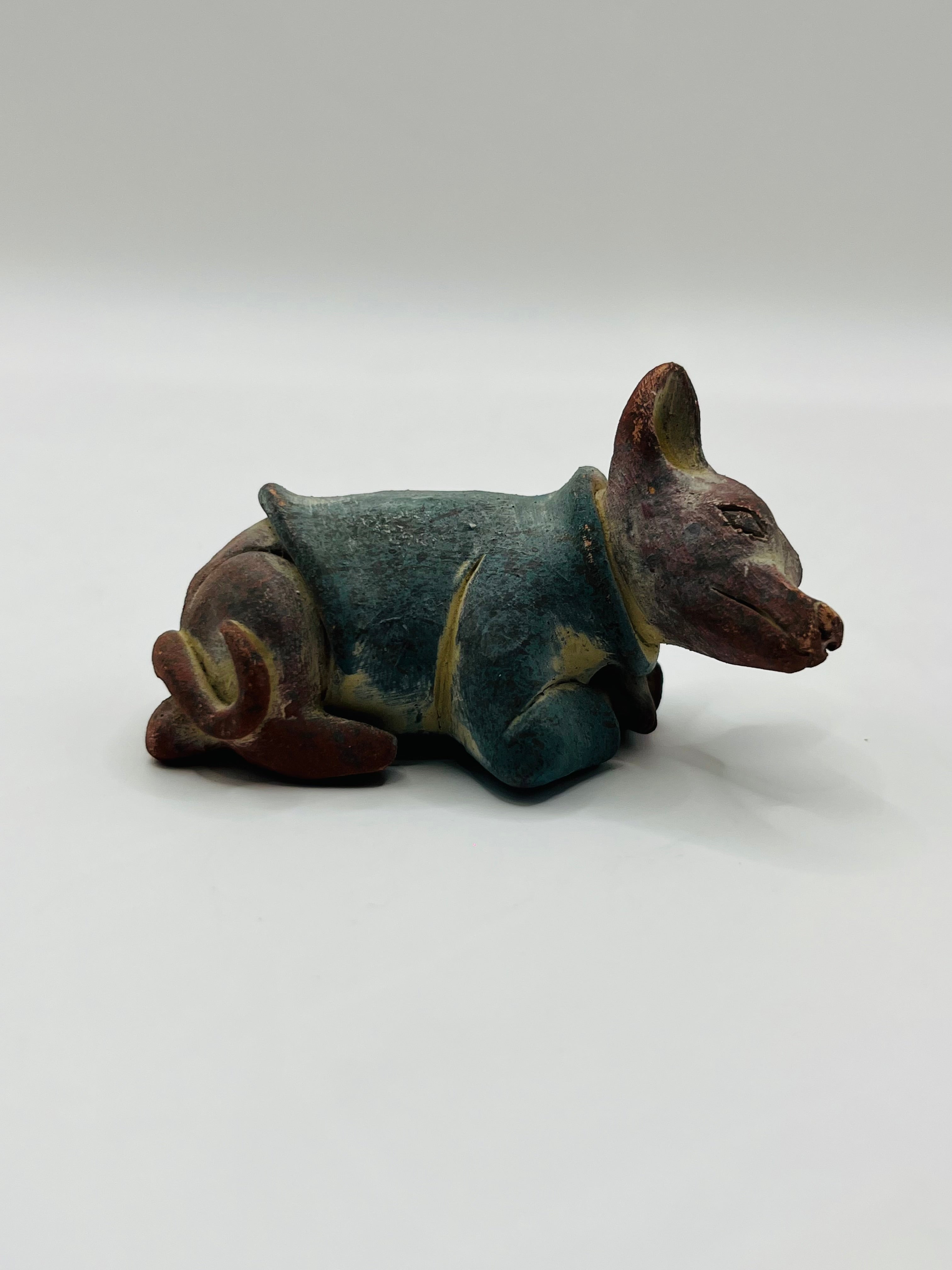Réplica de Xolo mini recostado, con suéter verde de barro.