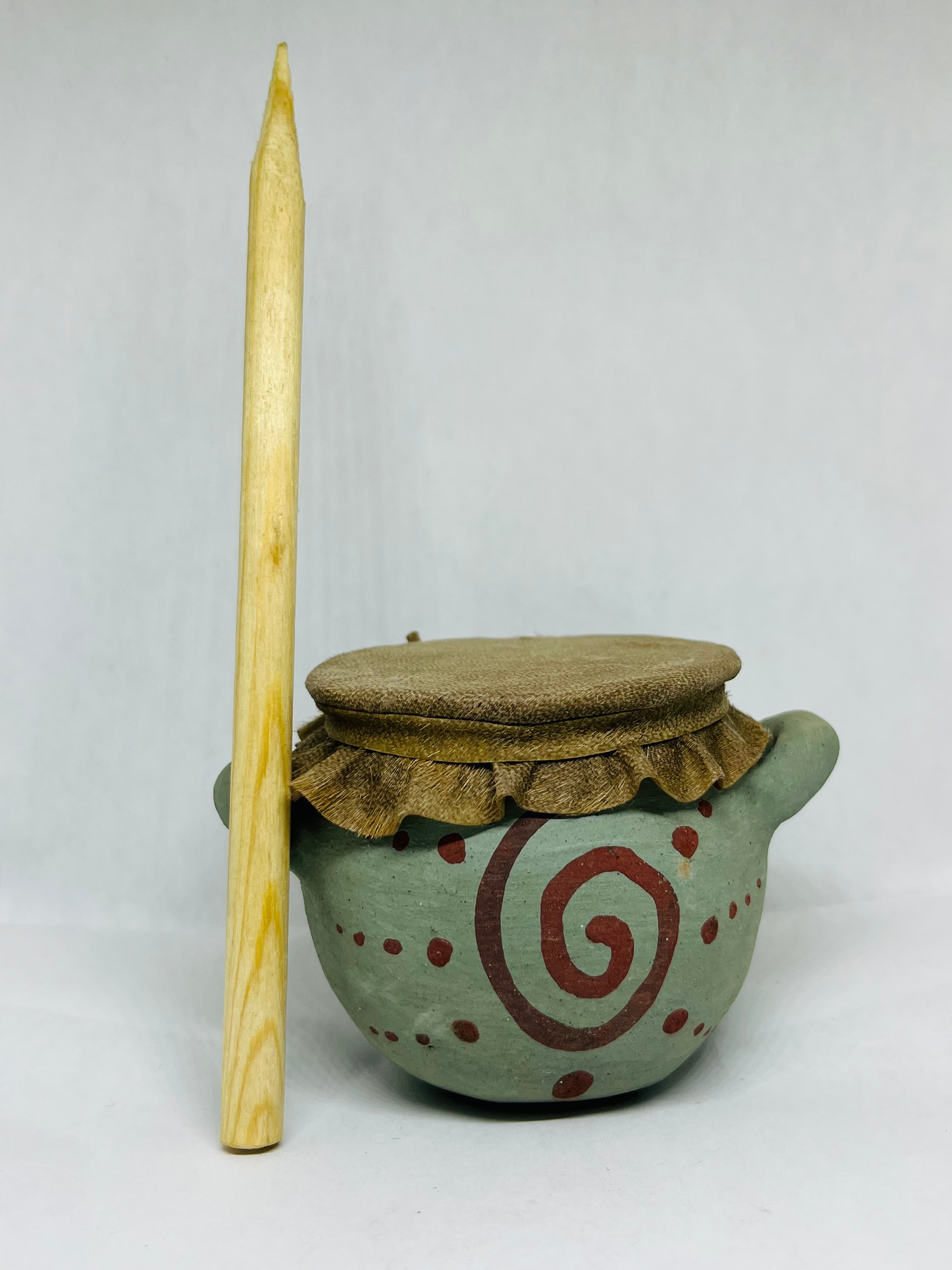 Tambor de barro azul con diseño de caracol y puntos rojos, con palo de madera para emitir sonido.